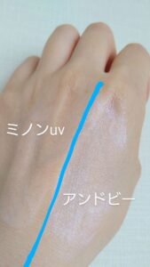 わかりやすいよう手持ちの日焼け止めの中では白いかな、と感じる「アンドビー」と半分ずつ塗ってみました。